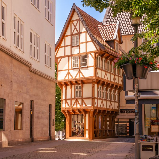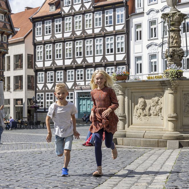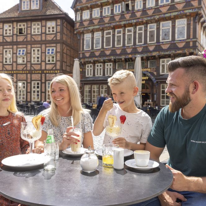 Starten Sie Ihre Entdeckertour auf dem historischen Marktplatz. Hier gibt es nicht nur leckeres Eis, sondern auch staunende Blicke. Das berühmte Knochenhauer-Amtshaus sieht aus wie aus einem Märchen. Nur wenige Schritte entfernt wartet eine echte Kuriosität, die Kinder zum Staunen bringt, der Umgestülpte Zuckerhut. Dieses Fachwerkhaus steht quasi auf dem Kopf und wird nach oben hin immer breiter.