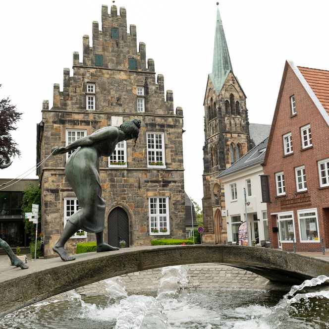 In Schüttorf zieht eine hagere, alte Frau zwei Ziegen über eine Brücke. Doch die Tiere stemmen die Hufe in den Boden und wehren sich vehement. So kommt das Trio keinen Zentimeter vom Fleck. Kein Wunder, es ist ja auch eine Statue, die hier gegenüber vom historischen Rathaus den Brunnen dekoriert.