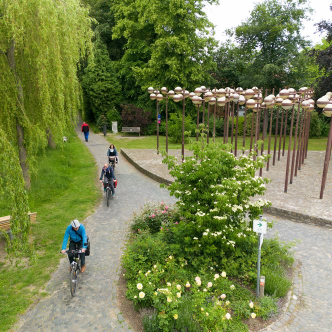 Jetzt ist es nicht mehr weit bis in die Niederlande. Viele Ausblicke und Eindrücke liegen hinter uns. Wir haben den Fahrtwind gespürt, das Tanzen der Sonnenstrahlen in den Alleen gesehen und uns immer wieder von Skulpturen, Installationen und Kunstwerken überraschen lassen. Und dabei die weite Landschaft bewundert, die oft genug selbst zum Gemälde wurde.